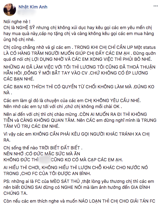 Mới đây, thông qua trang Facebook cá nhân, Nhật Kim Anh bất ngờ chia sẻ dòng trạng thái bức xúc về việc bị người khác nói xấu sau lưng. Theo đó, nữ ca sĩ tức giận viết: “Chị là nghệ sĩ nhưng chị không xúi giục hay kêu gọi các em yêu mến chị hay mua quà này, cáp nọ tặng chị và càng không kêu gọi các em mua hàng ủng hộ chị nhé.