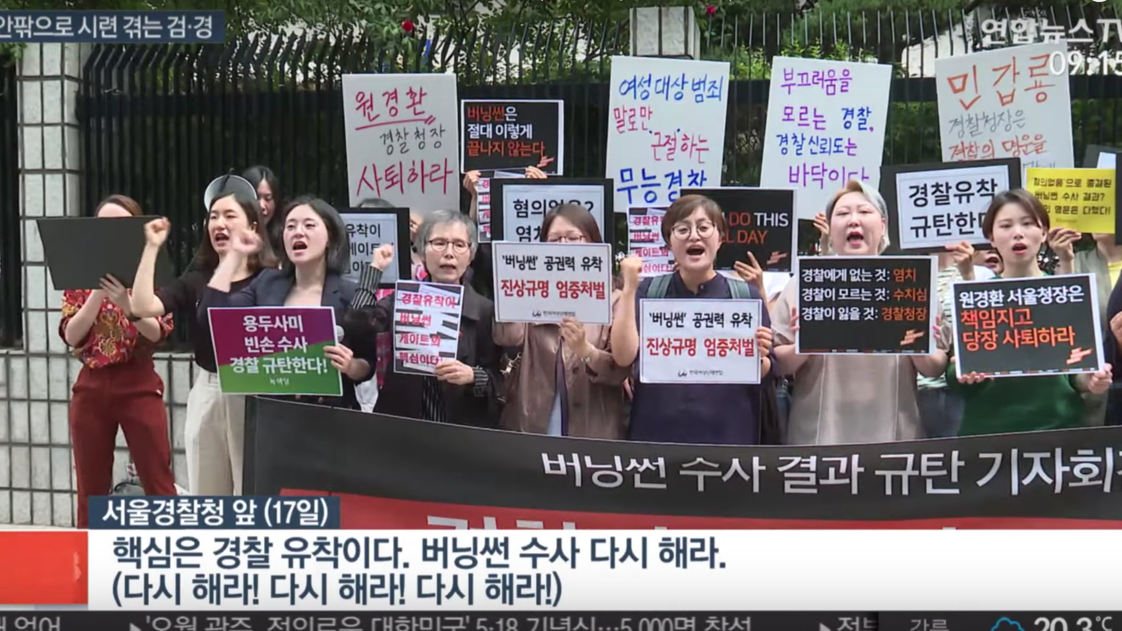 Trong một cuộc họp báo của những người biểu tình trước cơ quan Cảnh sát Thủ đô Seoul hôm thứ sáu vừa qua, một đại diện lên tiếng: “Báo cáo của cảnh sát cho rằng không có mối quan hệ đáng ngờ nào giữa cảnh sát và ngành công nghiệp tình dục, và không có cáo buộc nào có thể chống lại tổng giám đốc Yoon. Seungri và các nhân vật chủ chốt khác của Burning Sun Gate có thể tự do đi lang thang trên đường phố. Kết quả của cuộc điều tra này cho thấy quyền lực của nam giới được đề cao như thế nào và sự kêu gọi công lý cho phụ nữ dễ dàng bị im lặng như thế nào“.