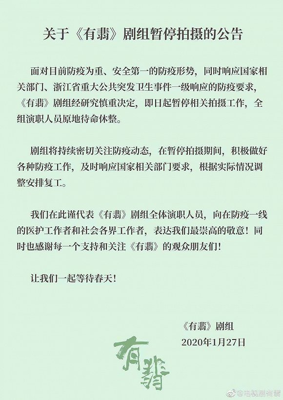 Nếu như ghi hình show gặp ảnh hưởng thì việc khởi quay các phim truyền hình cũng không thể tránh khỏi. Trước mắt, Hữu phỉ của Triệu Lệ Dĩnh và Vương Nhất Bác, Cảm ơn bác sĩ của Dương Mịch, Đại giang đại hà của Vương Khải… đều tuyên bố tạm thời ngưng toàn bộ, đoàn phim ở những nơi khác đang đợi lệnh.
