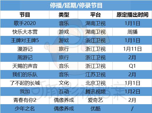 Sau khi 7 bộ phim đện ảnh tuyên bố dời lịch ra mắt, hàng loạt chương trình giải trí (show) cũng chịu ảnh hưởng như Vương bài đối vương bài, Khoái lạc đại bản doanh (những show có rating tương đối cao) chọn lựa tạm ngừng lên sóng. Đến cả chương trình với lượng nhân lực, vật lực lớn như Ca sĩ cũng tuyên bố tạm dừng đến đầu tháng hai phát sóng. Trong quá trình ghi hình, chương trình cũng hủy bỏ khán giả trường quay thay vào bằng bỏ phiếu trên mạng.