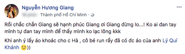 Mới đây, thông qua trang Facebook cá nhân, Hương Giang khiến cư dân mạng không khỏi bật cười khi chia sẻ ảnh tham dự sự kiện vào tối 27/3 cùng Hồ Ngọc Hà và Kim Lý kèm theo dòng trạng thái: “Rồi chắc chắn Giang sẽ hạnh phúc, Giang ơi Giang đừng lo. Không ai đan tay mình tự đan tay mình để thấy mình không lạc lõng.