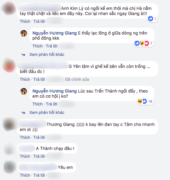 Khi có người nói: “Ghế kế bên vẫn còn trống, biết đâu được”, Hương Giang hài hước trả lời: “Lúc sau Trấn Thành ngồi đấy, theo em có cơ hội gì không?”.