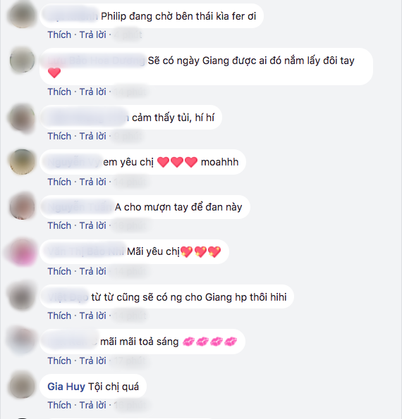 Song song đó, cô cũng nhận được nhiều lời khích lệ từ mọi người, chắc chắc cô sẽ có được người đàn ông xứng đáng ở bên cạnh. Chưa kể, một cư dân mạng còn nhiệt tình để lại lời nhắn: “Philip đang chờ ở bên Thái kìa Fer (tên tiếng Anh của Giang) ơi!”