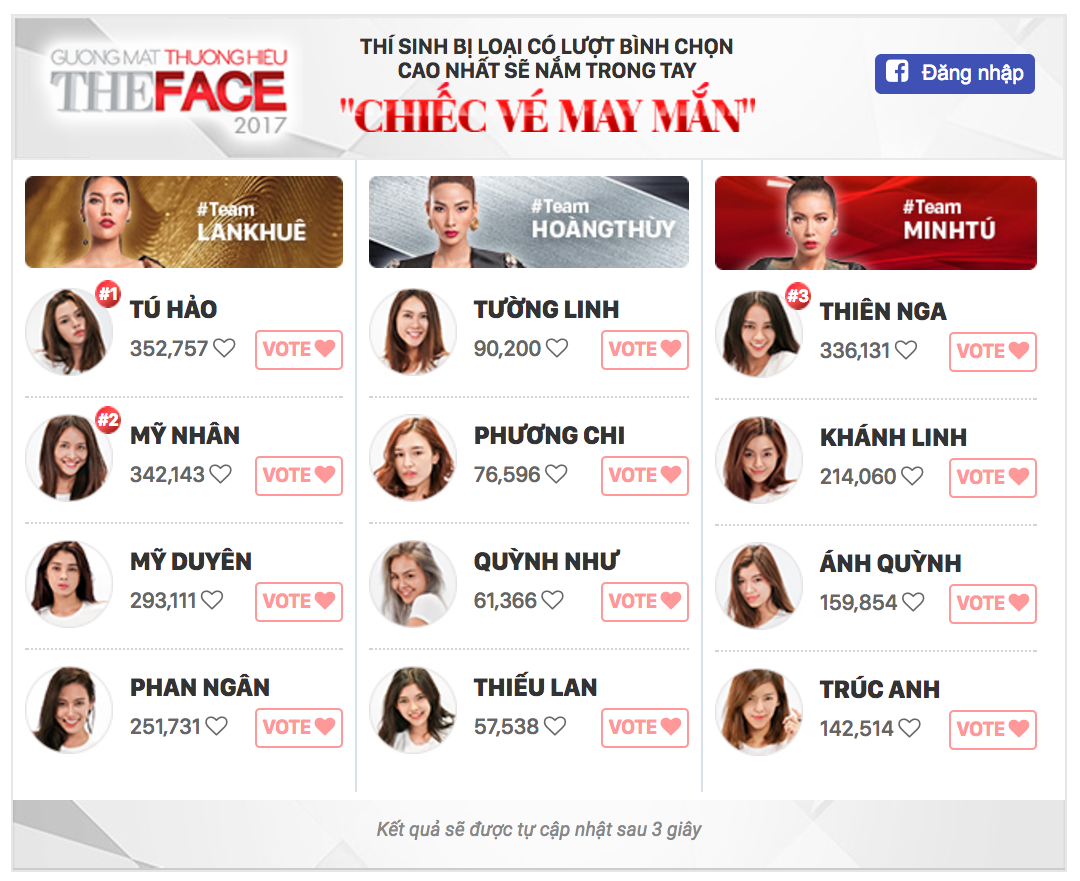Bạn có thể truy cập trang chủ của Saostar bình chọn cho Quỳnh Như hoặc thí sinh mình yêu thích để trao Chiếc vé may mắn trở lại đêm Chung kết của The Face Vietnam 2017 nếu họ bị loại trước đó.