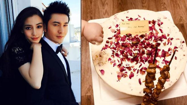 Kỷ niệm 2 năm ngày cưới, Huỳnh Hiểu Minh đăng ảnh thịt xiên nướng cùng và chiếc bánh gato với dòng tin nhắn lãng mạn: “Gửi Baby, mừng kỷ niệm 2 năm! Yêu em, Hiểu Minh“.
