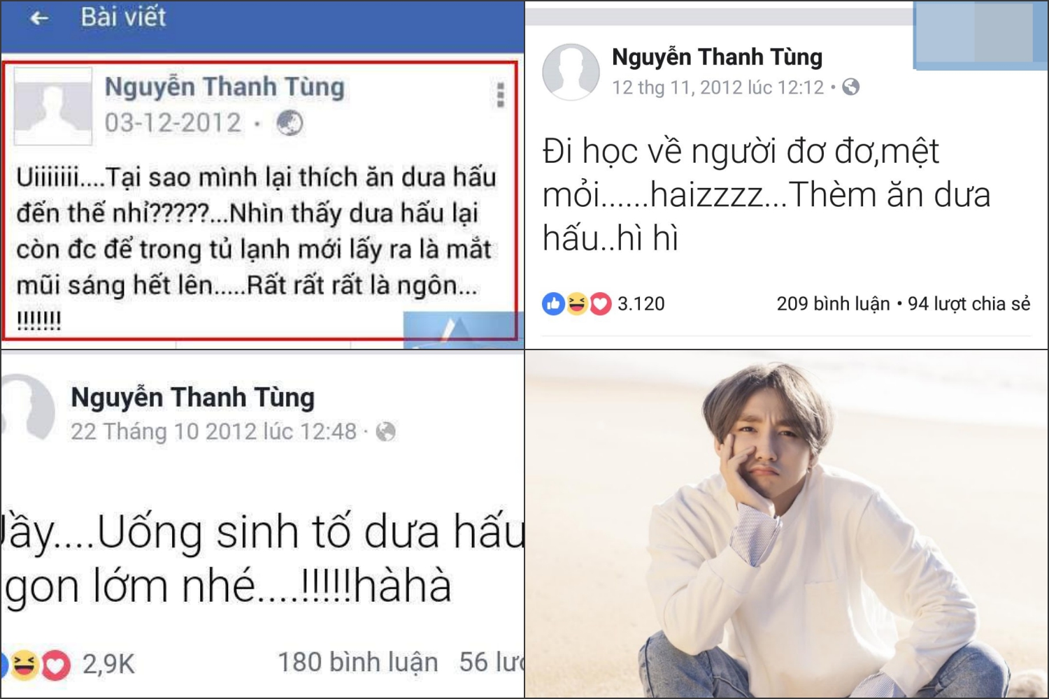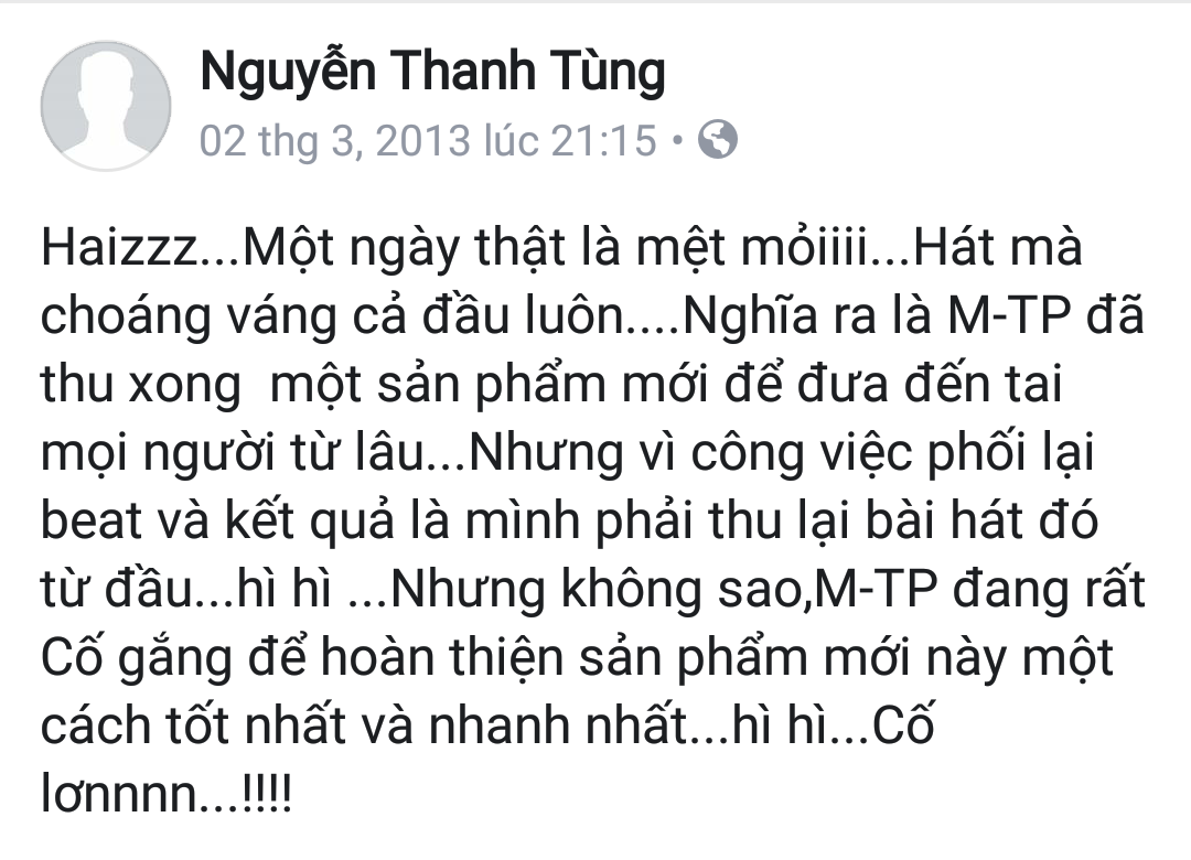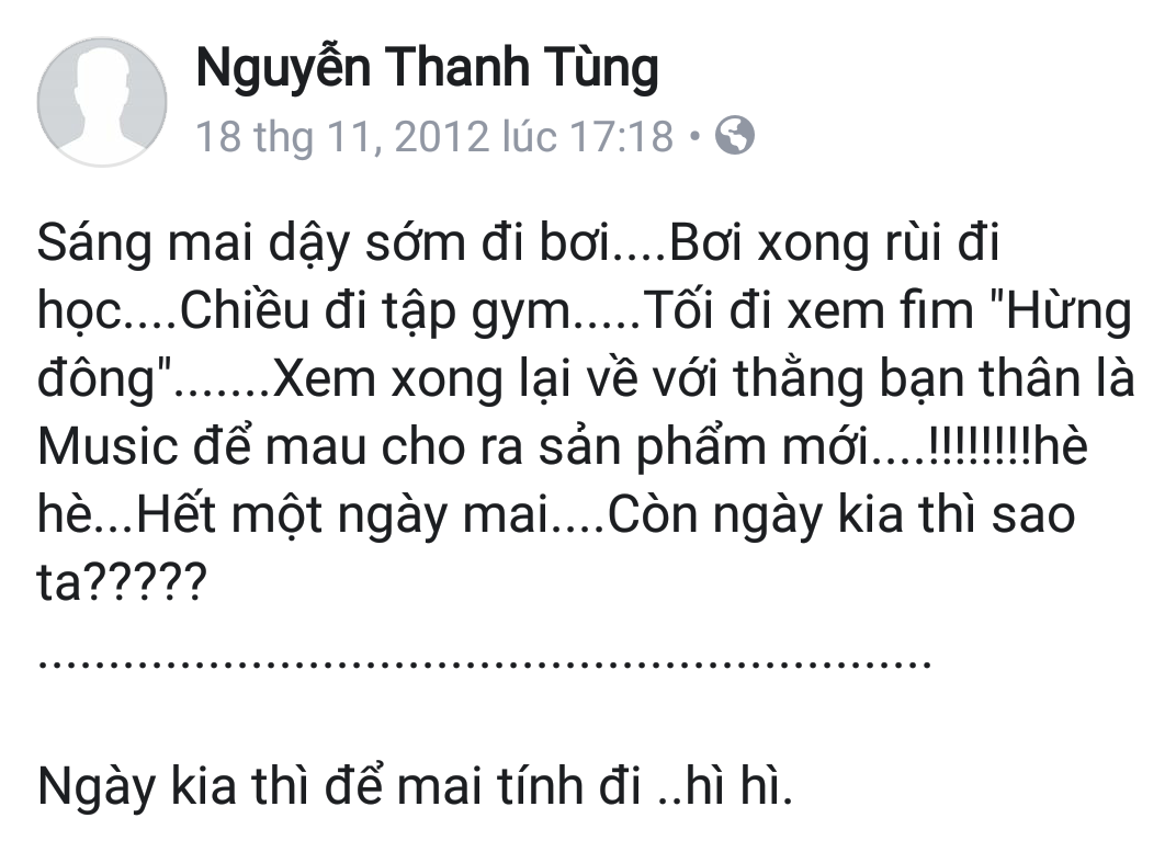Mặc dù vậy, khi lật ngược thời gian trở về khoảng 5,6 năm trước đây, chắc hẳn ai cũng phải ngạc nhiên và bất ngờ vì có một Sơn Tùng rất khác. Anh thường xuyên chia sẻ những dòng trạng thái có phần trẻ con từ chuyện ăn, ngủ, học hành,… tất tần tật đều được nam ca sĩ gốc Thái Bình bày tỏ trên Facebook khiến fan vô cùng thích thú.