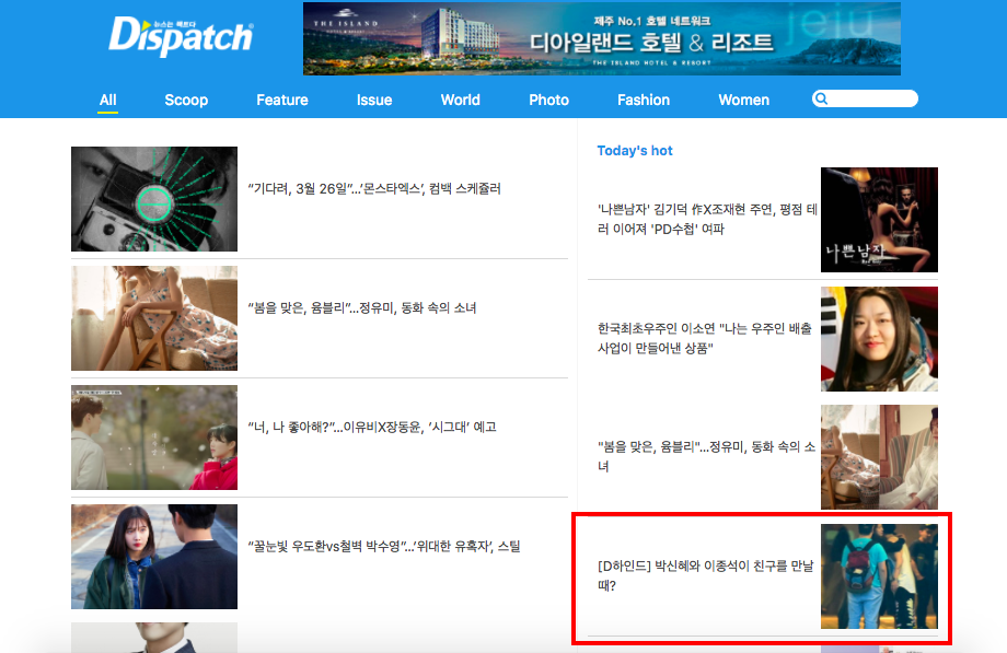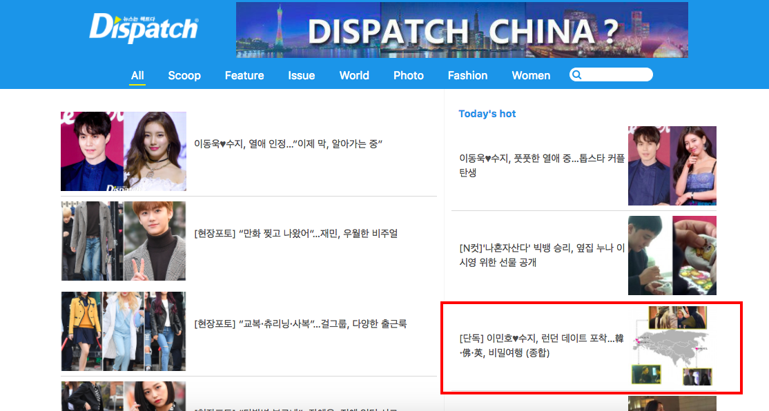 Tương tự như trường hợp của Lee Min Ho, Lee Jong Suk cũng bất ngờ trở thành “bóng đèn” bất đắc dĩ. Cụ thể, sau khi “bạn gái tin đồn” năm xưa bị khui chuyện tình cảm, loạt ảnh hẹn hò bí mật giữa anh và Park Shin Hye cách đây 3 năm được Dispatch đăng tải chễm trệ trên top bài báo được tìm đọc nhiều nhất.
