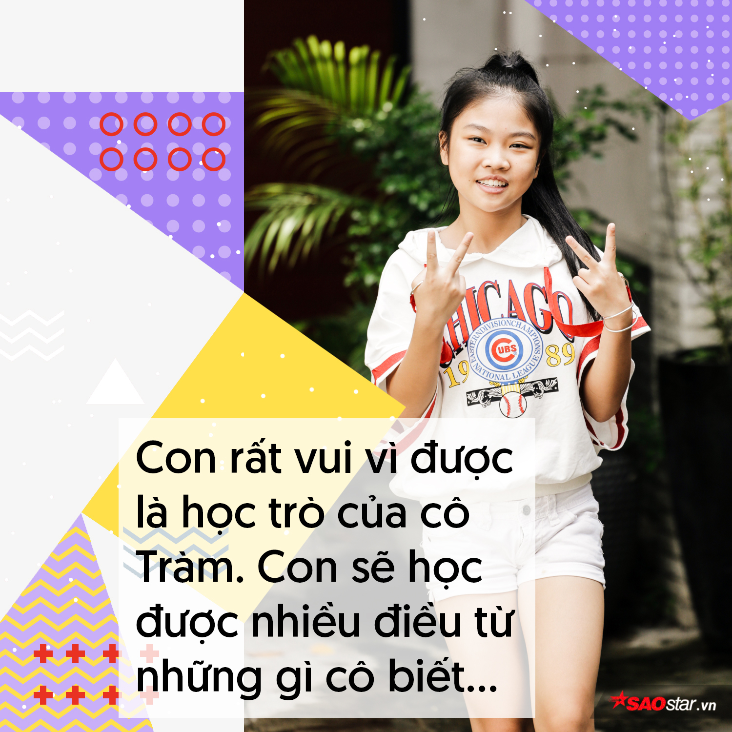Lúc con vô đội cô Tràm thực sự con không biết cô Tràm là học trò của cô Thu Minh, con chỉ biết cô là quán quân Giọng hát Việt thôi. Đến khi mẹ nói thì con mới biết. Con thấy rất vui vì mình được là học trò của cô Tràm vì sẽ được học nhiều điều từ những gì cô Tràm biết.
