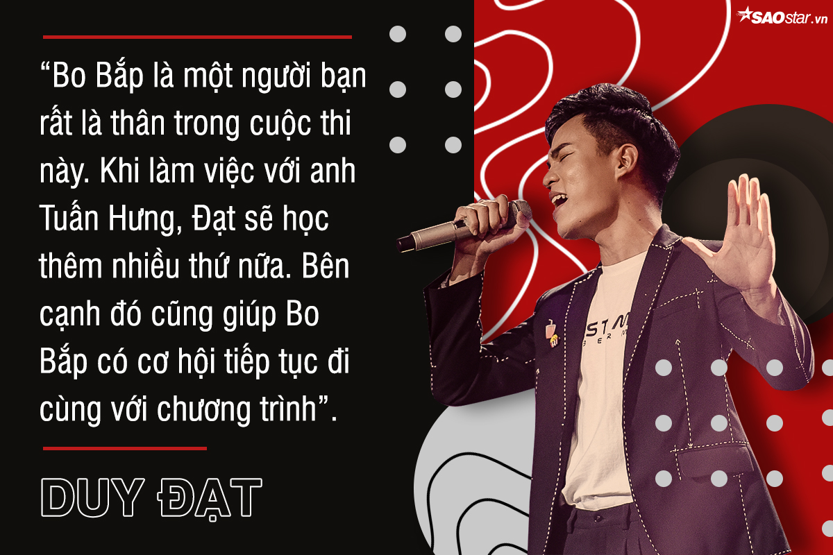 Là người bạn thân thiết, Duy Đạt cũng không nỡ cướp đi cơ hội của bạn, nam thí sinh chia sẻ: “Bo Bắp là một người bạn rất là thân trong cuộc thi này. Khi làm việc với anh Tuấn Hưng, Đạt sẽ học thêm nhiều thứ nữa. Bên cạnh đó cũng giúp Bo Bắp có cơ hội tiếp tục đi cùng với chương trình”. Điều này đồng nghĩa với việc Duy Đạt chấp nhận chọn về team Tuấn Hưng để Bo Bắp không vì mình mà bị loại khỏi đường đua Giọng hát Việt.