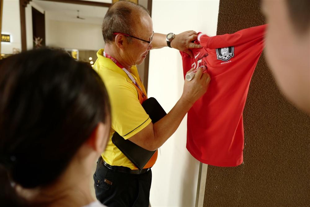 HLV Park Hang Seo tranh thủ kí tặng áo cho các fan hâm mộ.