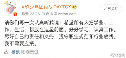 Tối ngày 10 tháng 5, Tiêu Chiến đăng tải bài viết trên weibo, một lần nữa anh nhấn mạnh mối quan hệ giữa minh tinh và fan hâm mộ. Nam diễn viên hy vọng fan có thể quan tâm đến cuộc sống của chính họ, tôn trọng quy tắc nghề nghiệp và giới hạn của ngành nghề sau đó mới là theo đuổi minh tinh. Cuối cùng, Tiêu Chiến đúc kết bằng một câu nói: “Tôi không cần tiếp ứng (ủng hộ)”. Vốn là một minh tinh thần tượng, anh chàng có thể nói ra lời này thật sự cần phải có dũng khí. Bởi là ngôi sao, đặc biệt là minh tinh lưu lượng (idol), sự nghiệp phụ thuộc hoàn toàn vào fan hâm mộ. Nếu không cần sự ủng hộ, tiếp ứng của fan hâm mộ thì tiền đồ của minh tinh đó coi như tan thành mây khói!