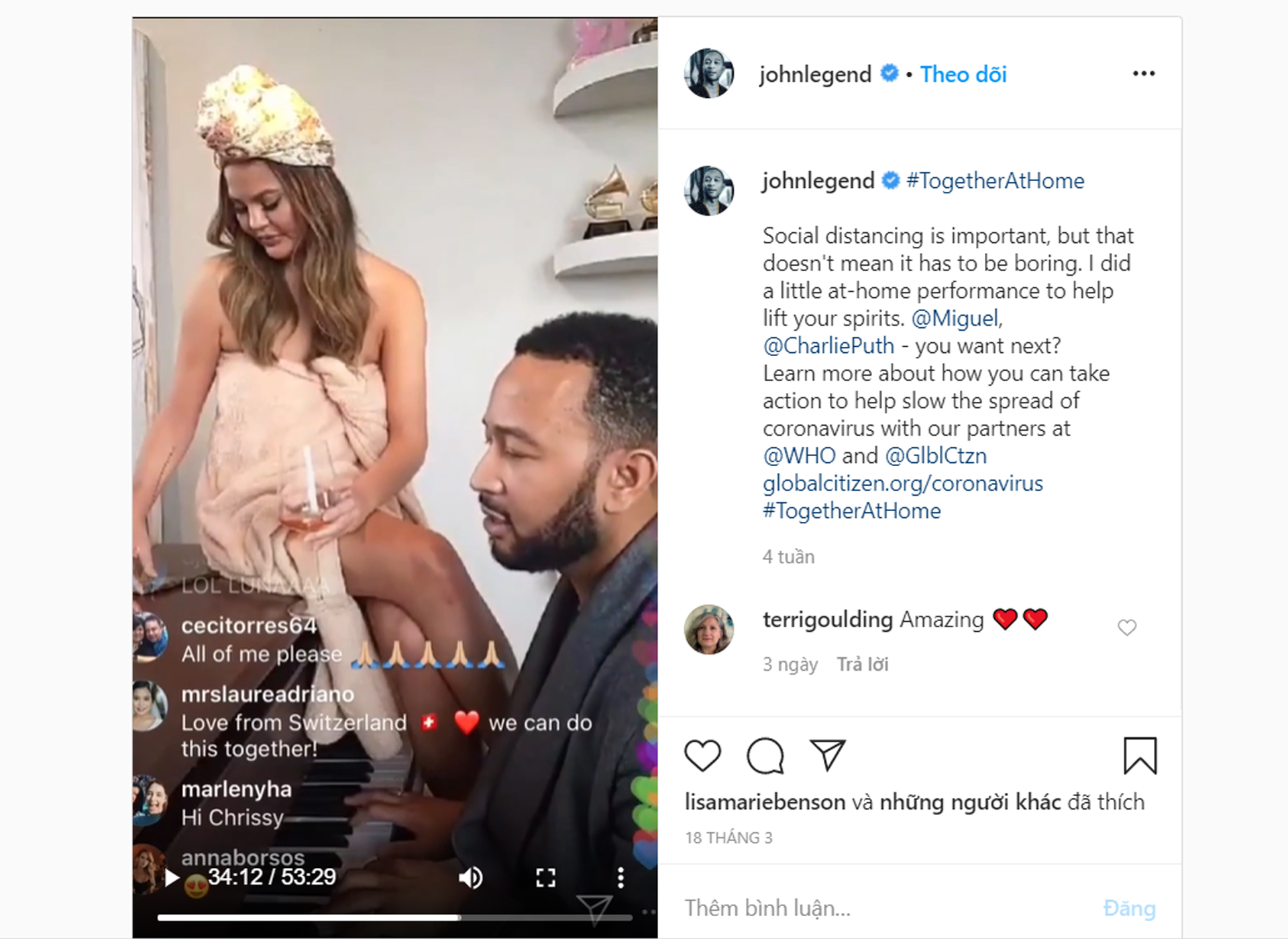 Nam ca sĩ từng gây bão với bản hit All of Me - John Legend cũng quyết định dùng thời gian tự cách ly xã hội để ở bên gia đình. Anh mời khán giả xem trực tiếp, vợ cùng con nhỏ thưởng thức buổi biểu diễn nhỏ hàng loạt ca khúc nổi tiếng của anh ngay tại căn phòng của nhà mình. Nhiều khán giả còn tinh ý nhận ra loạt giải thưởng Grammy cũng được anh trưng bày ở trong căn phòng này.