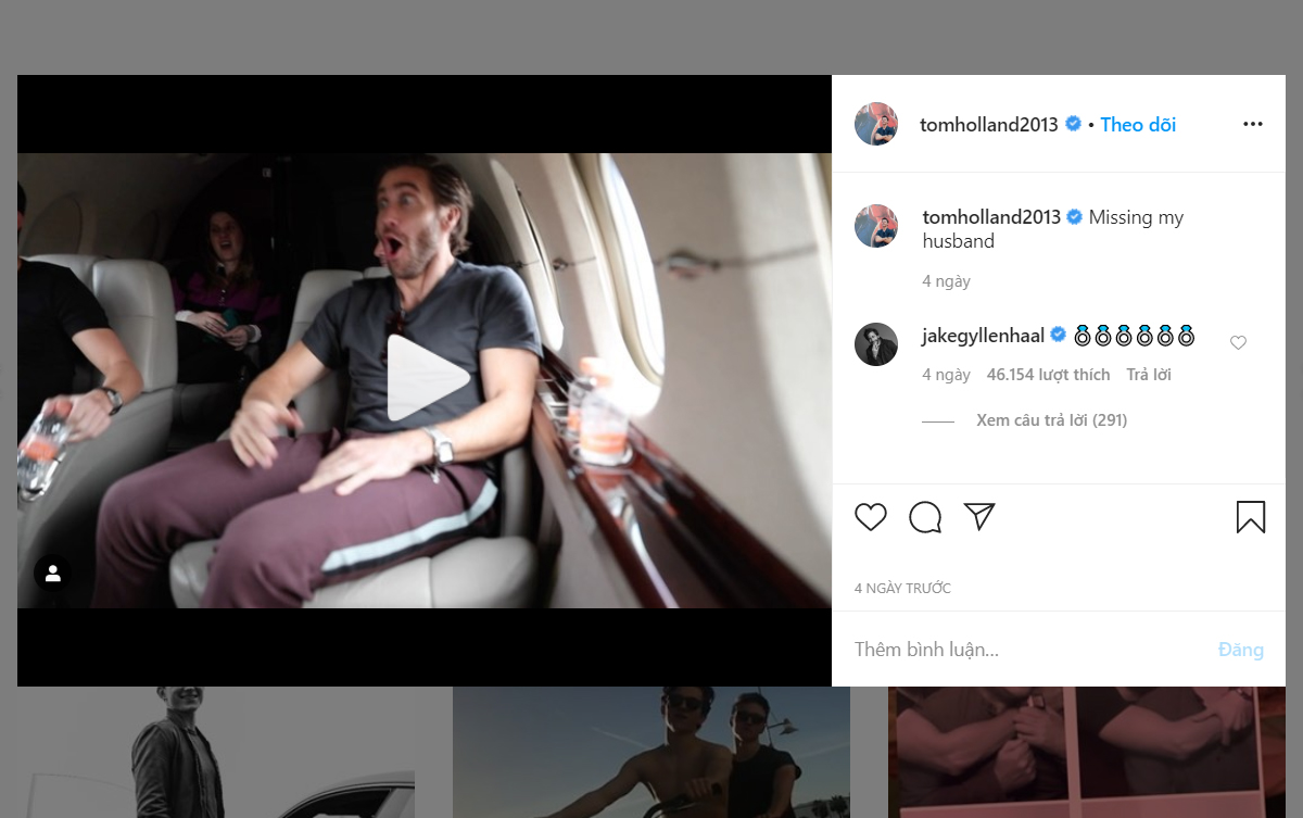 Cuối cùng, không thể không kể đến người vào vai “Nhện Nhọ” phiên bản của Marvel - Tom Holland. Sau khi thực hiện một thử thách khá kỳ lạ - vừa “chồng cây chuối” vừa mặc áo, vừa qua, nam diễn viên đã đăng tải một đoạn clip cũ anh ngồi cùng máy bay với Jake Gyllenhaal - người vào vai Mysterio trong Spider-Man: Far From Home cùng với tựa đề: Missing my husband (tạm dịch: Nhớ chồng yêu của tôi). Hiện tại người hâm mộ không biết đây là một thử thách mà nam diễn viên phải thực hiện hay do anh quá “rảnh” trong thời gian tự cách ly xã hội.