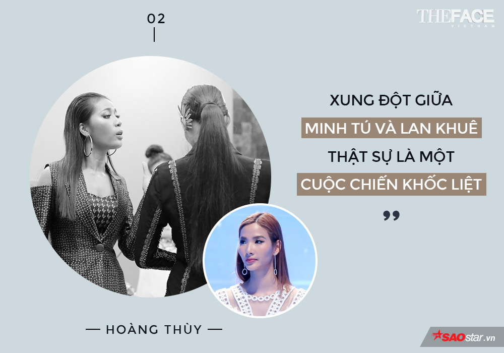 Sau 3 tập phát sóng, khán giả của The Face Việt Nam 2017 đã dễ dàng nhận ra cuộc cạnh tranh kịch liệt giữa 3 HLV Hoàng Thùy, Minh Tú và Lan Khuê. Tuy nhiên, nếu Lan Khuê cho thấy sự điềm tĩnh khi ngồi trên ghế nóng thì Hoàng Thùy và Minh Tú lại được ví như như “cơn lốc”, luôn tranh giành nhau rất quyết liệt trong bất kể thử thách nào.