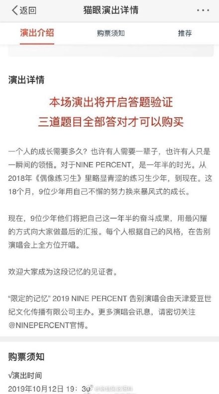 Sắp tới đây, Nine Percent sẽ có buổi conccert cuối cùng vào ngày 12 tháng 10, sau đó chính thức rã nhóm. Rất nhiều cư dân mạng lên tiếng kêu ca thay cho fan hâm mộ Nine Percent khi họ muốn mua vé xem concert thì phải trả lời đúng ba câu hỏi mới có thể mua.