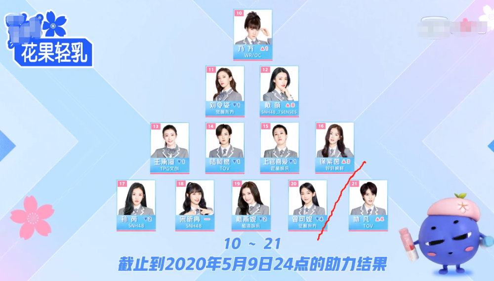 Vị trí từ thứ 10 - thứ 20 lần lượt gồm: Nãi Vạn (NINEONE), Lưu Lệnh Tư, Đới Manh, Vương Thừa Tuyển, Lục Kha Nhiên, Thượng Quan Hỉ Ái, Từ Tử Nhân, Tôn Nhuế, Tống Hân Nhiễm, Đới Yến Ny, Tăng Khả Ny. Lâm Phàm với vị trí thứ 21 đã phải nói lời tạm biệt với vòng chung kết.