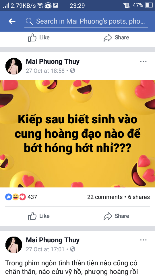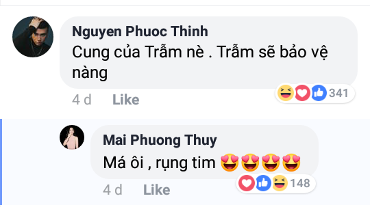 Trước đó trong một bài đăng khác của Mai Phương Thúy, ngày 27/10 nói rằng: “Kiếp sau biết sinh vào cung hoàng đạo nào để bớt hóng hớt nhỉ?”, Noo đã vào comment: “Cung của Trẫm nè. Trẫm sẽ bảo vệ nàng.” Kết quả Mai Phương Thúy rụng tim với lời nói của Noo.