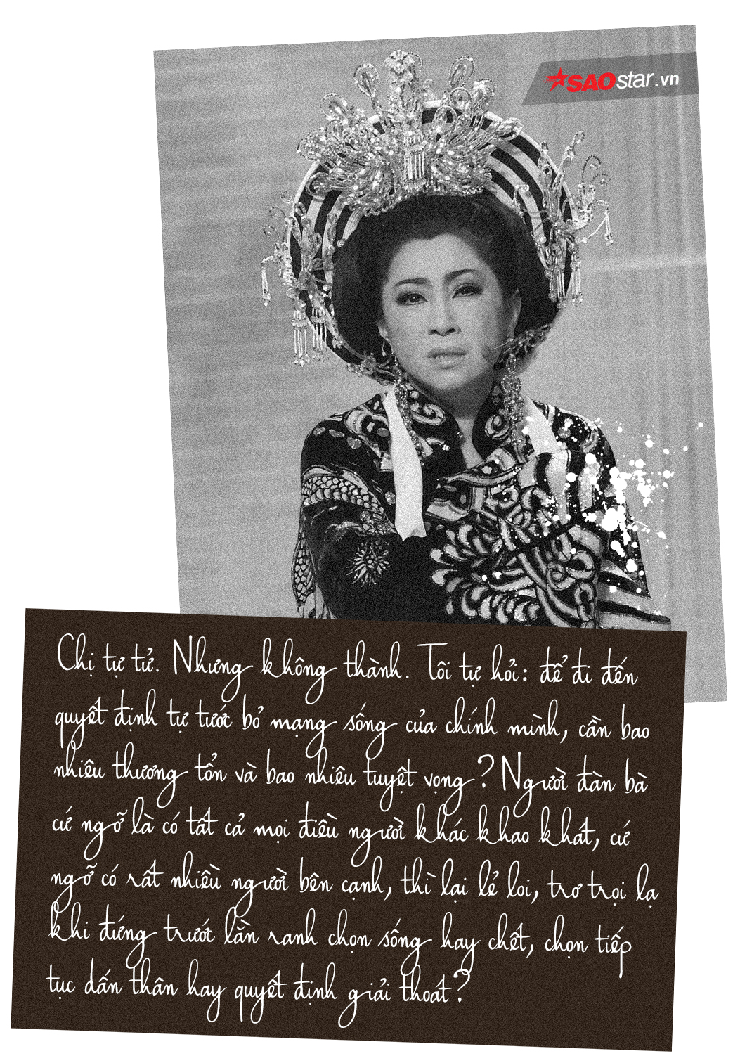 Chị tự tử. Nhưng không thành! Tôi tự hỏi: để đi đến quyết định tự tước bỏ mạng sống của chính mình, cần bao nhiêu thương tổn và bao nhiêu tuyệt vọng? Người đàn bà cứ ngỡ là có tất cả mọi điều người khác khao khát, cứ ngỡ có rất nhiều người bên cạnh, thì lại lẻ loi, trơ trọi lạ khi đứng trước lằn ranh chọn sống hay chết, chọn tiếp tục dấn thân hay quyết định giải thoát?