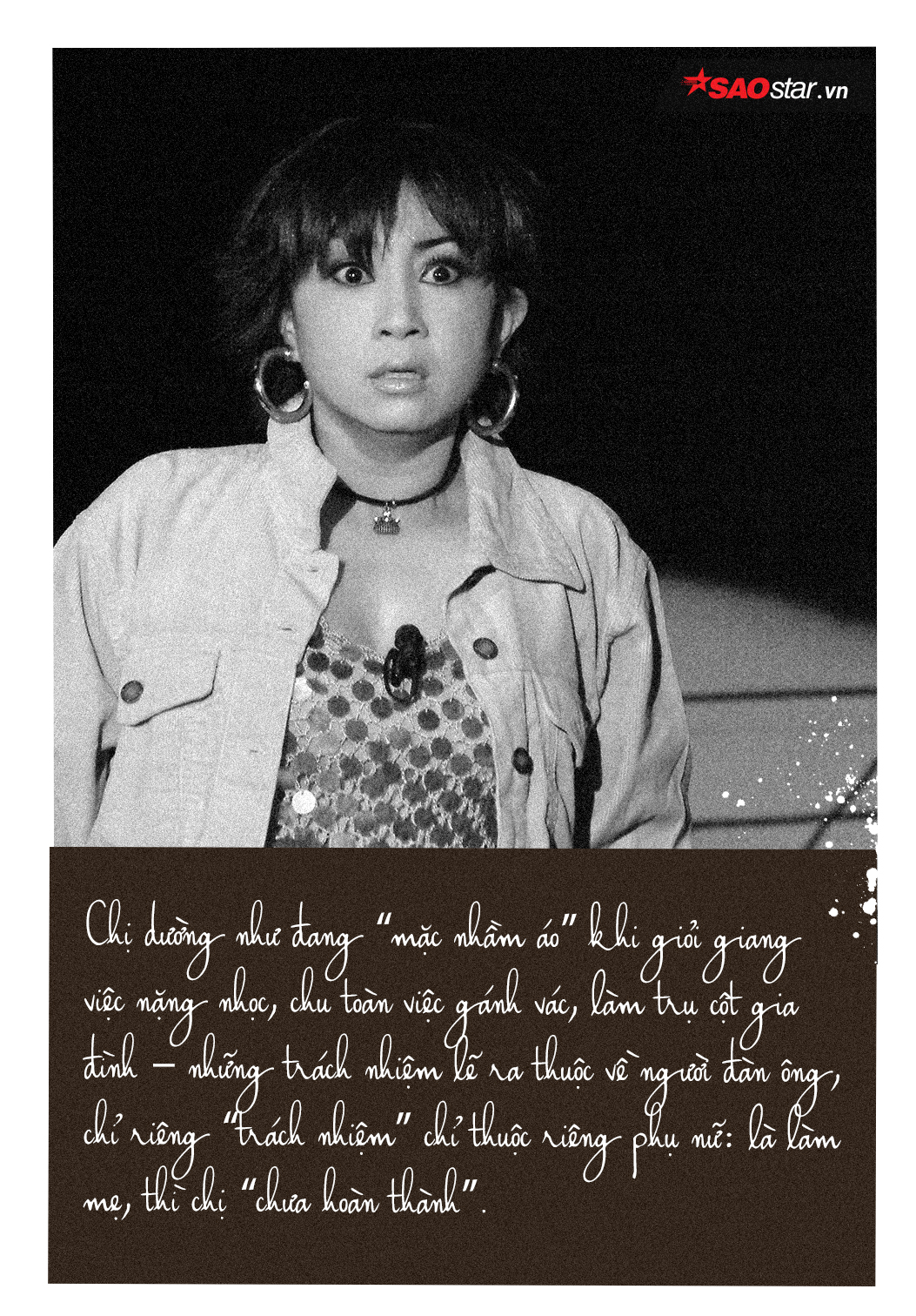 Chị chưa từng lạm dụng cái nghề của chị mà bỏ rơi gia đình. Thành ra, đôi khi nghĩ do cái số và nghiệp duyên của mình ngắn ngủi, và mình không có được may mắn. Biết trách ai bây giờ!