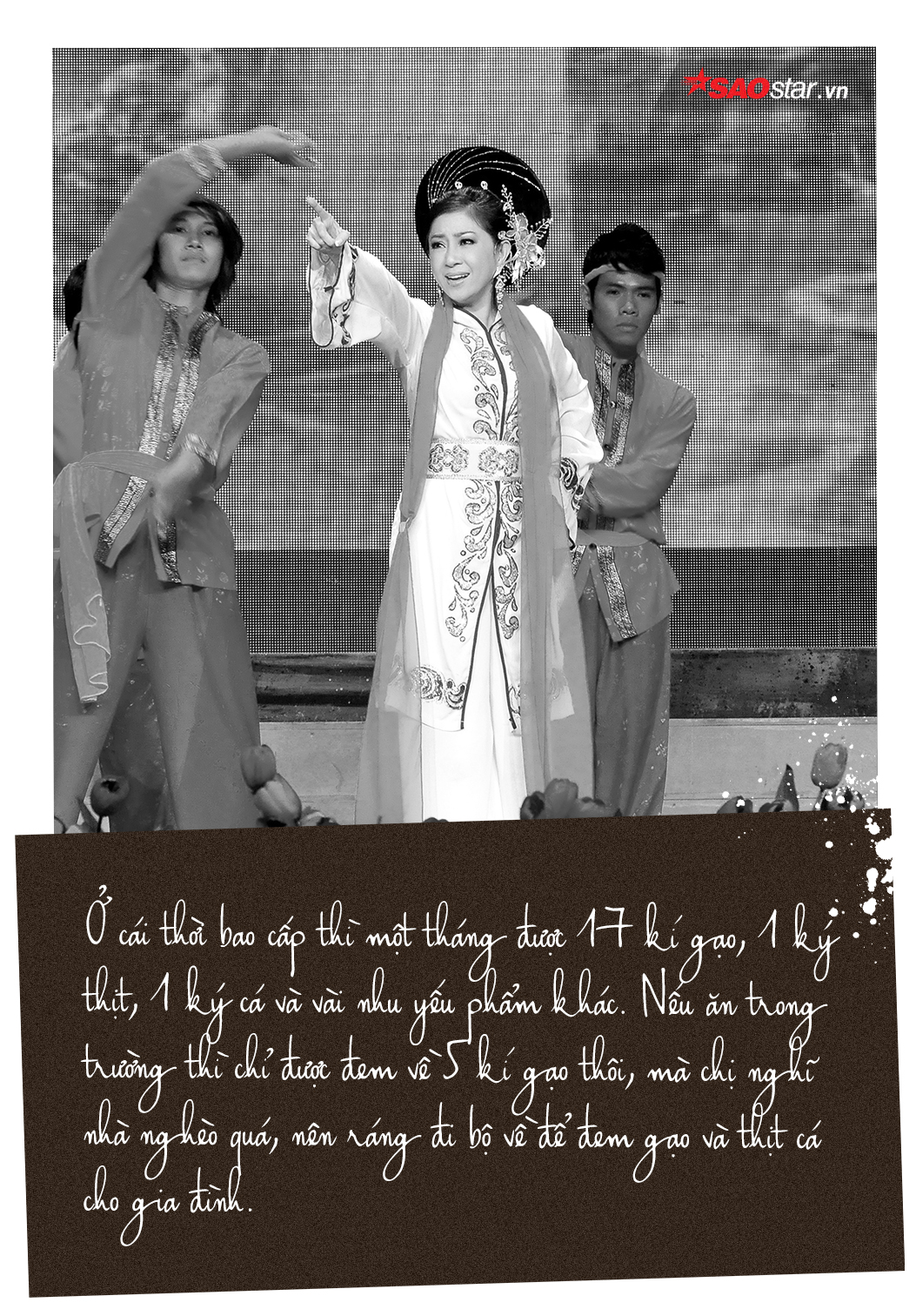 3 giờ chiều là lại xách cái cà mên, nhiều khi chỉ toàn cơm và nước tương, lâu lắm mới có một cái trứng, đi vô rạp hát ngồi ăn. Tối thì chị đi bộ về, hoặc lâu lâu quá giang bạn nếu thuận đường.