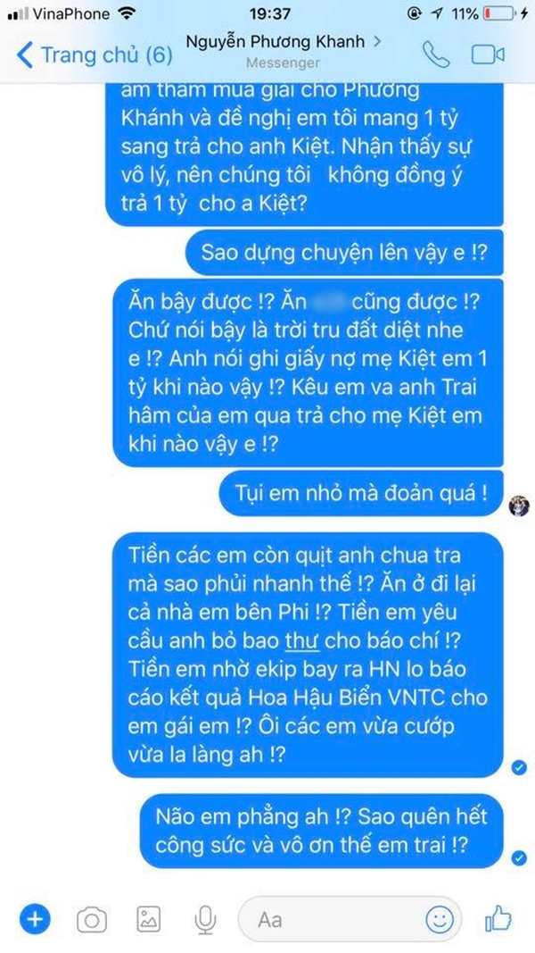 Anh trai Phương Khánh khẳng định: “Đưa ra được bất kỳ bằng chứng gì anh đã âm thầm bỏ 10 tỷ mua giải cho em tôi, em tôi sẽ trả lại vương miện cho Miss Earth“. Ngoài ra, anh còn chia sẻ: “Sự thật là khi em tôi vừa đoạt giải, Anh Phúc Nguyễn đã nói với tôi ngoài chi phí tổ chức sự kiện , anh Phúc có ghi giấy nợ nhận 1 tỷ của anh Kiệt để âm thầm mua giải cho Phương Khánh và đề nghị em tôi mang 1 tỷ sang trả cho anh Kiệt. Nhận thấy sự vô lý, nên chúng tôi không đồng ý trả 1 tỷ cho anh Kiệt“.