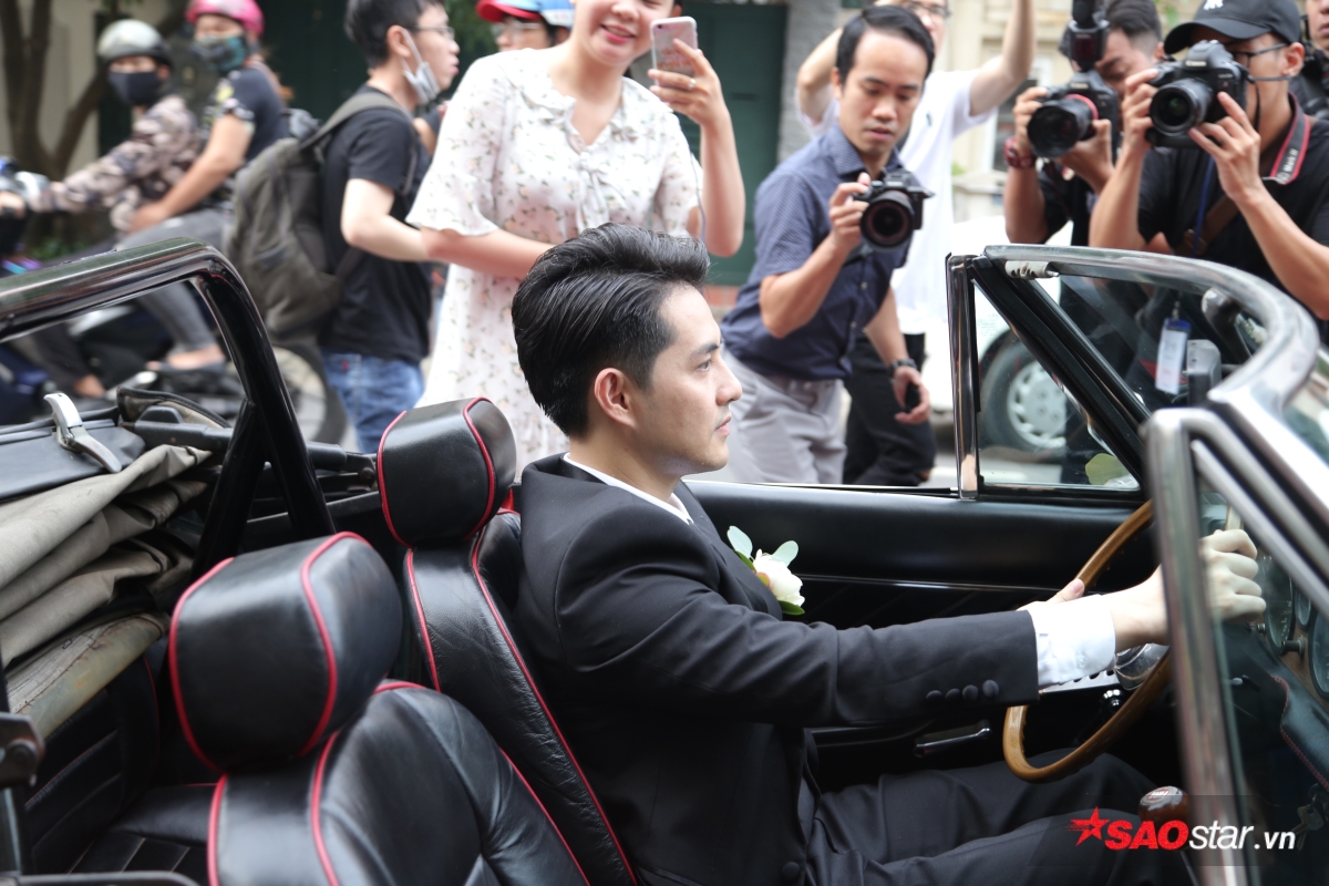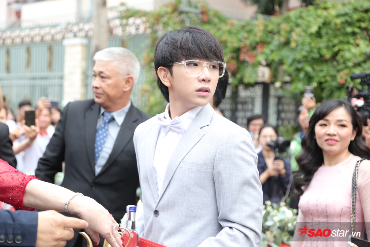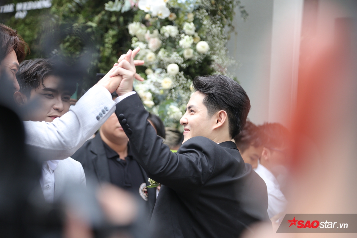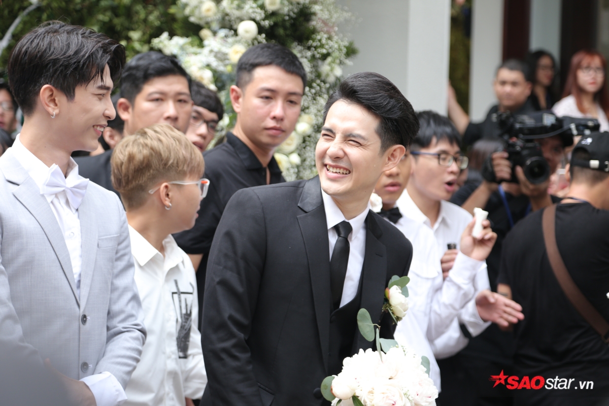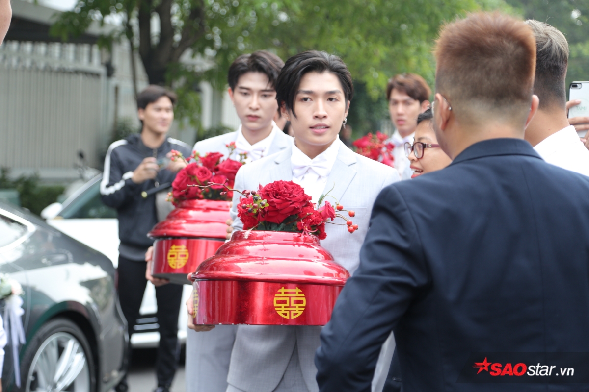 Sau khi chuẩn bị sẵn sàng sính lễ, đoàn xe từ nhà Ông Cao Thắng đã có mặt tại biệt thự của Đông Nhi để tiến hành làm lễ đón dâu. Hộ tống chú rể là dàn bưng tráp “soái ca” với những gương mặt quen thuộc như Song Luân, Anh Tú và các chàng trai Uni5. Ông Cao Thắng diện suit bảnh bao, tươi cười cùng đại diện nhà trai tiến vào để thực hiện các nghi thức cần thiết trước khi cùng Đông Nhi làm lễ trước bàn thờ gia tiên.