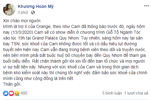 “Rất chân thành gửi lời xin lỗi đến ban tổ chức và mọi người vì sự bất tiện này. Nhưng với sức khoẻ của Cam và trong thời gian dịch bệnh khó kiểm soát này thì chúng tôi nghĩ việc đảm bảo sức khoẻ của chính mình cũng như cộng đồng là trên hết”, trợ lý của Orange viết.