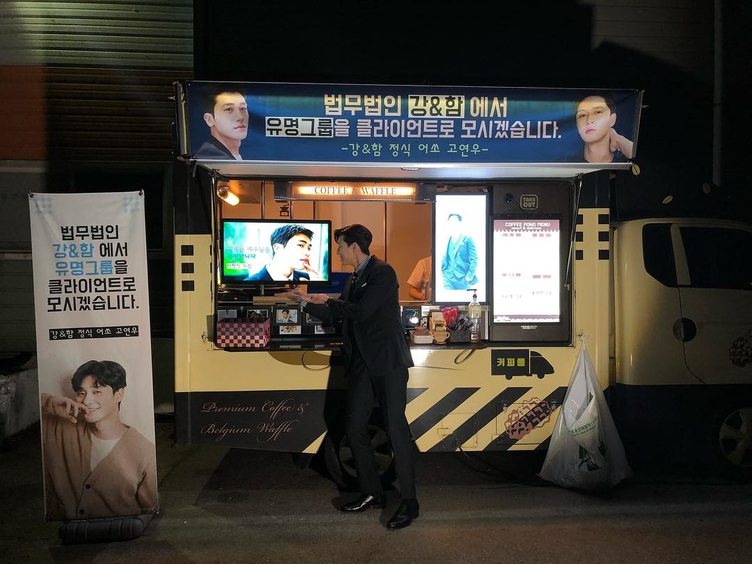 ..và V(BTS) đã gửi cả xe cà phê đến để cổ vũ tinh thần cho Park Seo Joon.