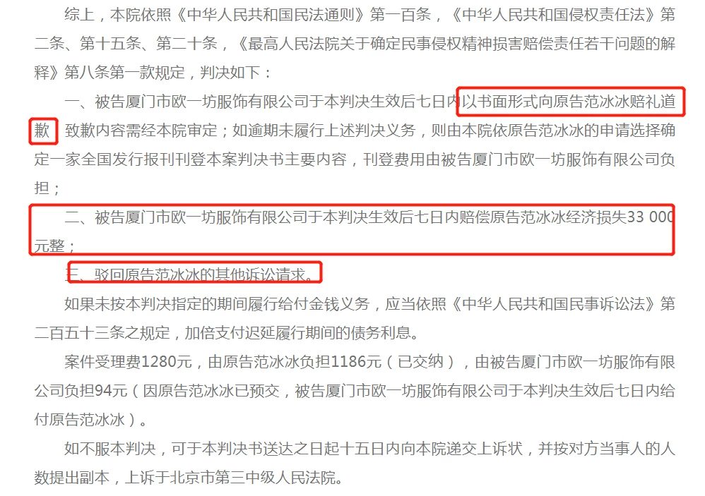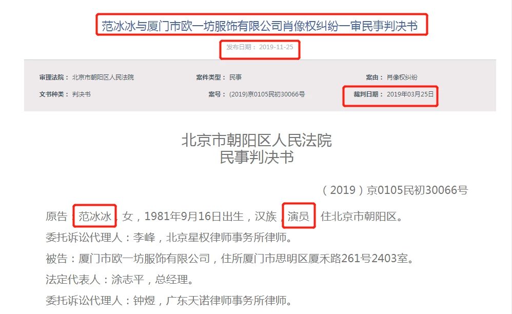 Với hành động này, Phạm Băng Băng cho rằng công ty kia đã xâm phạm đến hình ảnh thương mại của cô. Cuối cùng, tòa xét xử Phạm Băng Băng thắng kiện, công ty kia phải bồi thường cho cô số tiền tổn thất kinh tế lên đến 33 ngàn NDT (110 triệu đồng).