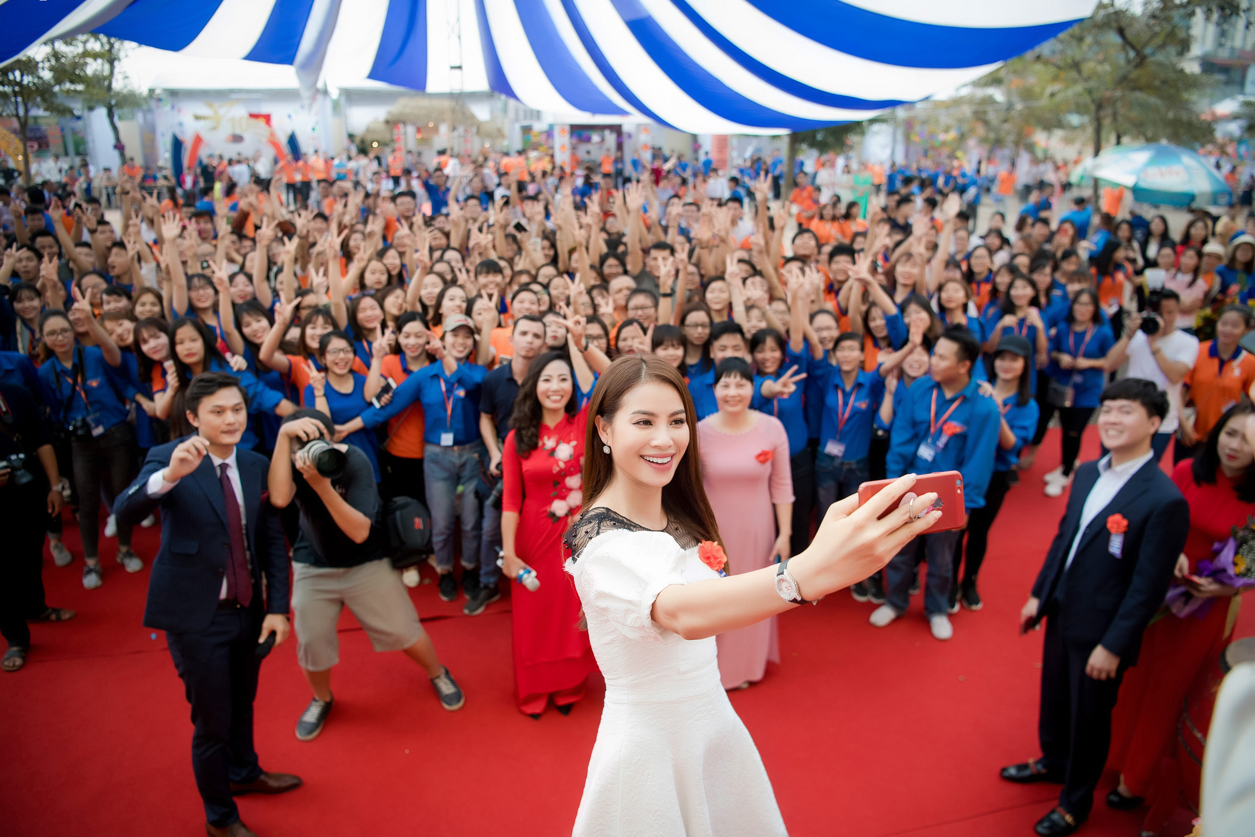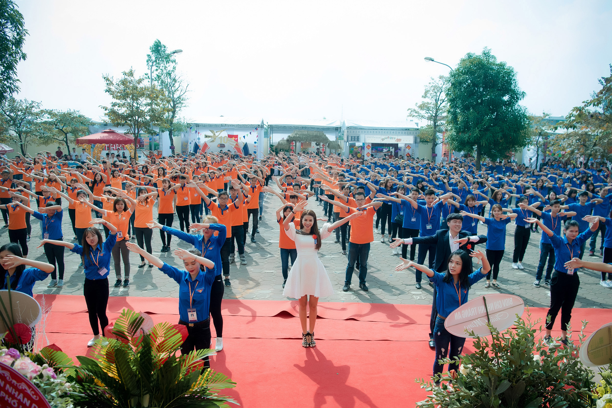 Điểm nhấn thú vị trong buổi lễ là hoạt động nhảy flashmob đồng diễn cùng hàng nghìn sinh viên. Màn trình diễn ngẫu hứng này khiến mọi người vô cùng thích thú. Cô cũng dành thời gian giao lưu chụp ảnh cùng các bạn sinh viên tại đây.