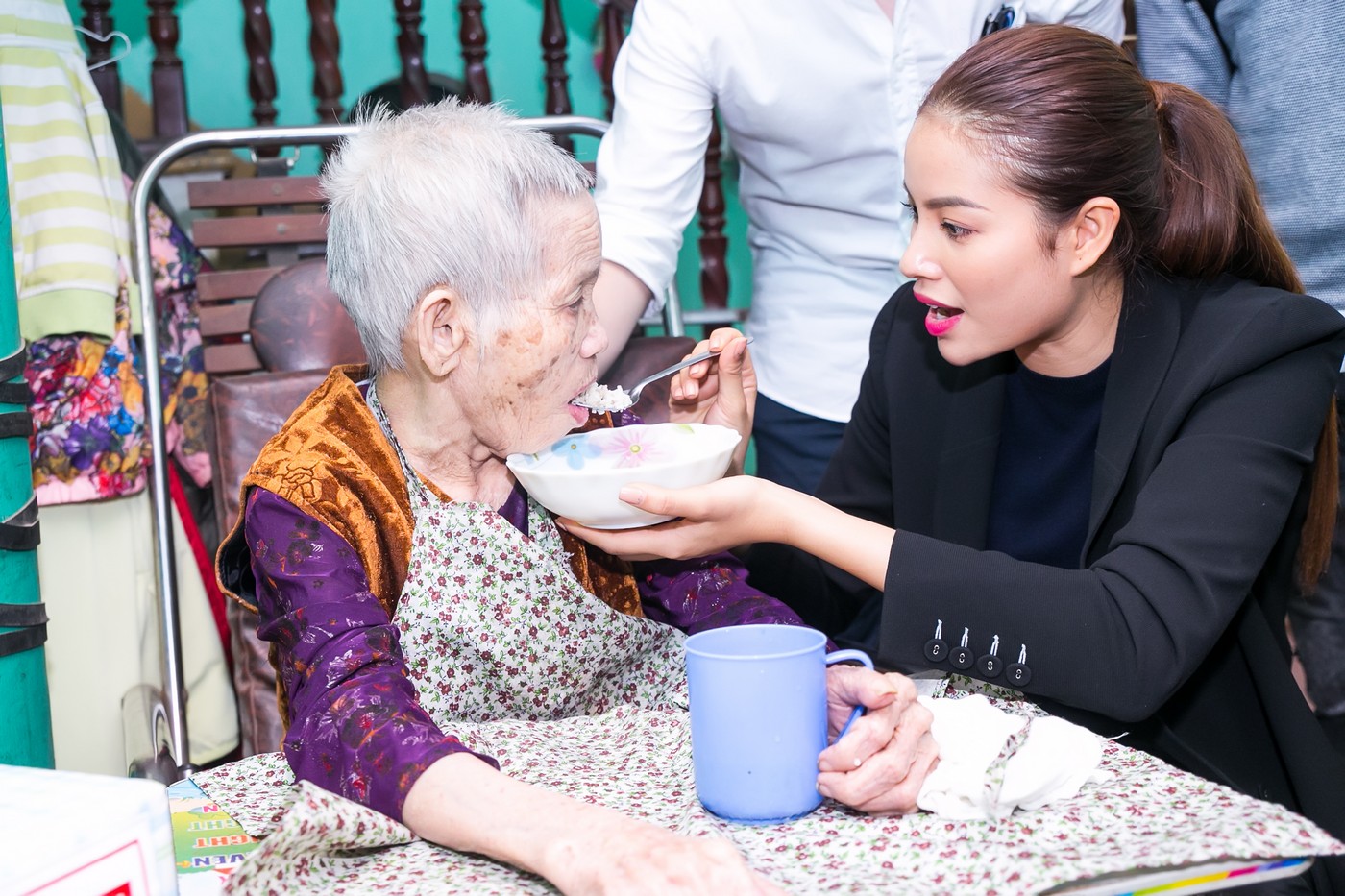 Hoa hậu Hoàn vũ Việt Nam 2015 nhiệt tình bón cơm cho một cụ bà. Phạm Hương cho biết, cô thương các cụ như bà ngoại mình và rất xúc động khi nghe các cụ kể về những hy sinh, mất mát trong chiến tranh.