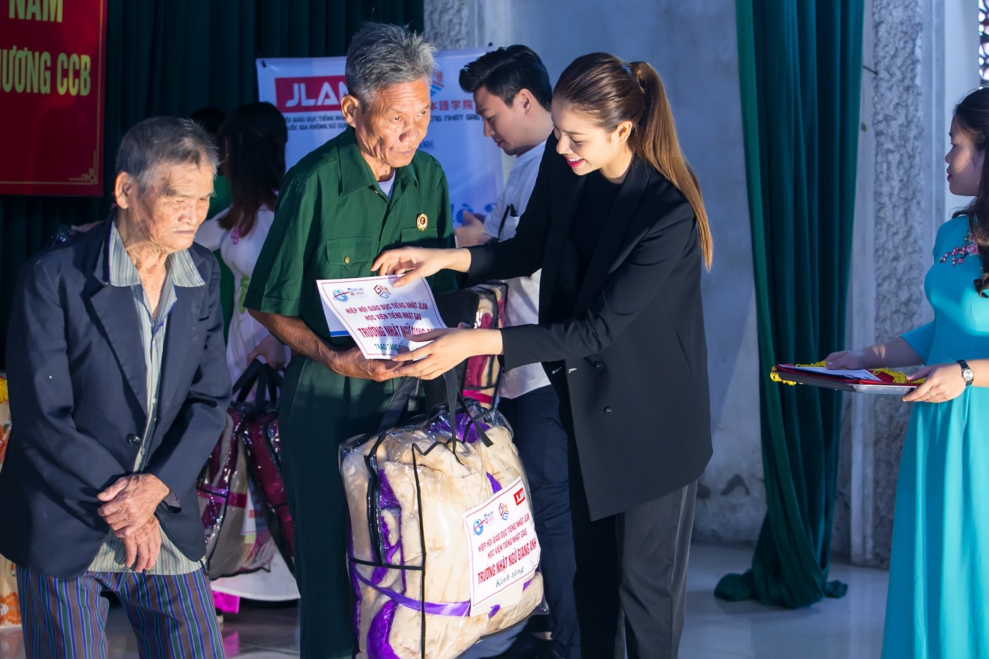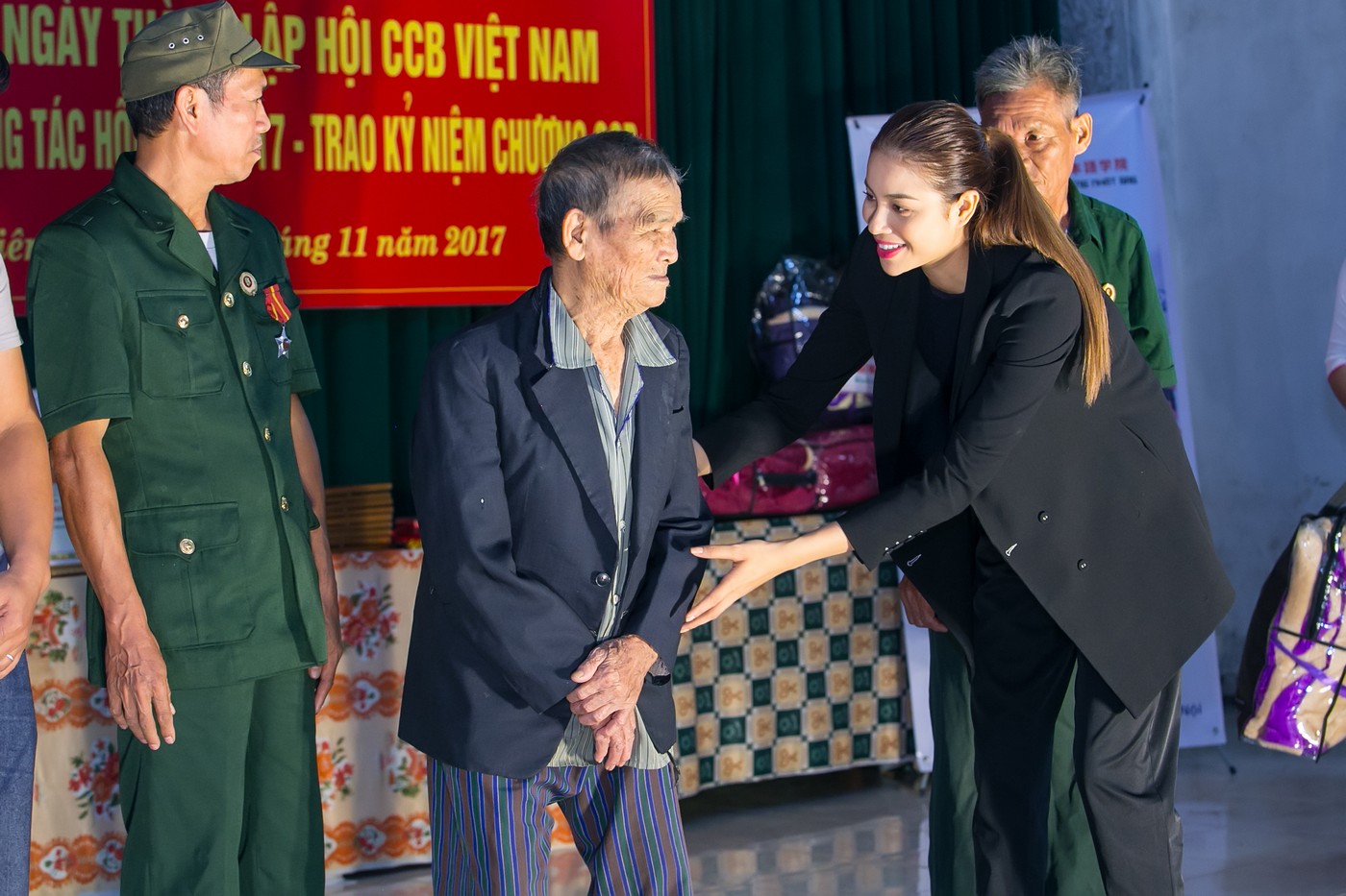 Tại đây, cô trao tặng nhiều phần quà ý nghĩa cho các gia đình thương binh có hoàn cảnh đặc biệt khó khăn trên địa bàn. Mỗi phần quà bao gồm tiền mặt, chăn ấm và những nhu yếu phẩm khác.