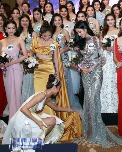 Hành động cúi người chỉnh lại trang phục cho Mâu Thuỷ giúp Phạm Hương ghi điểm với công chúng lẫn truyền thông.
