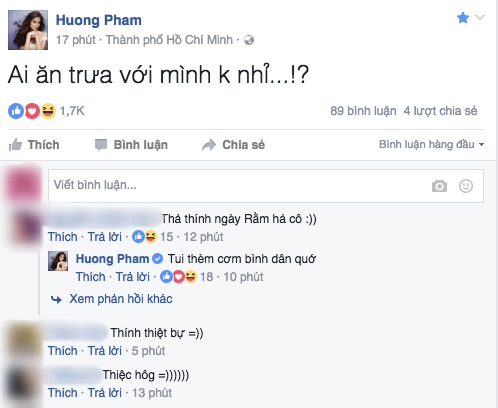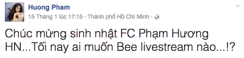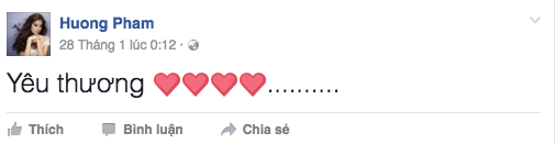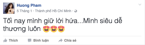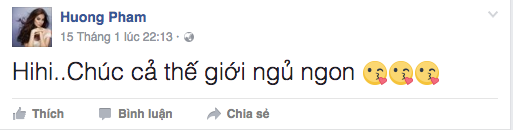 Cũng giống như nhiều người đẹp của Vbiz, trên trang facebook cá nhân, Phạm Hương rất chăm chỉ cập nhật và đăng tải những hình ảnh đời thường của mình. Thế nhưng, ngoài loạt ảnh quyến rũ đến “rụng tim”, Phạm Hương còn có cách cực độc đáo để “đốn gục” người hâm mộ. Đó chính là cứ thi thoảng lại “thả thính” bằng những lời đường mật cực ngọt ngào như thế này đây!
