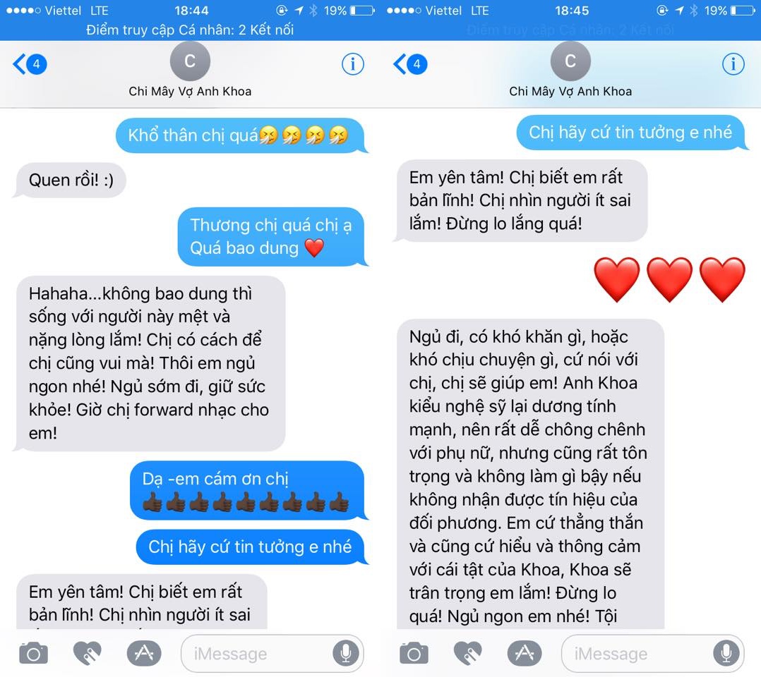 Những tin nhắn đầu, cô thừa nhận ông xã là người dễ chông chênh với phụ nữ đẹp, tuy nhiên vẫn tin tưởng Phạm Anh Khoa sẽ không “quá trớn” nếu không nhận lại tín hiệu từ đối phương. Ngoài ra, Thuỳ Trang khẳng định nếu không bao dung, cô khó có thể chung sống bên ông xã ngần ấy năm.