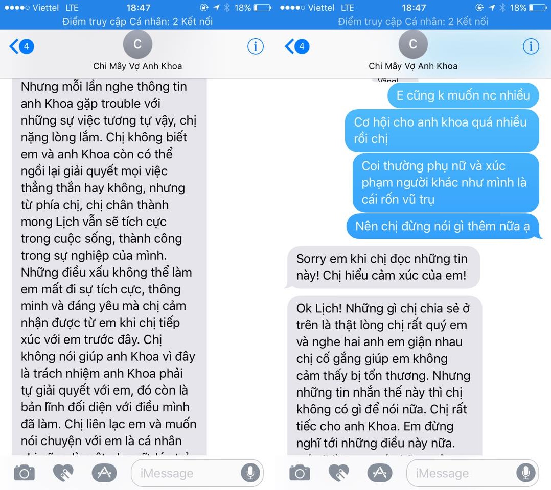 Dù vậy, càng về cuối cuộc trò chuyện, tần suất Thuỳ Trang cảm thông và xin lỗi Phạm Lịch thay chồng ngày càng dày đặc. Cô viết: “Chị không còn gì để nói nữa. Chị rất tiếc cho anh Khoa. Chị sẽ nói chuyện với Khoa về việc này. Chị nghĩ anh Khoa phải xin lỗi em vì điều này quá tệ. Nóng giận cỡ nào thì đàn ông không bao giờ nói với phụ nữ những lời lẽ như vậy. Chị cũng không chấp nhận được. Thực sự tức giận khi đọc những câu chữ kinh khủng như vậy”.