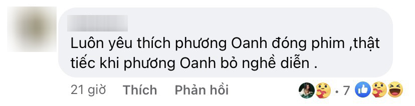 Bên cạnh những ý kiến khen ngợi về màn thay đổi phong cách, một netizen còn bày tỏ sự tiếc nuối khi Phương Oanh không còn xuất hiện nhiều trên màn ảnh. Người này viết: "Luôn yêu thích Phương Oanh đóng phim, thật tiếc khi bạn bỏ nghề diễn".