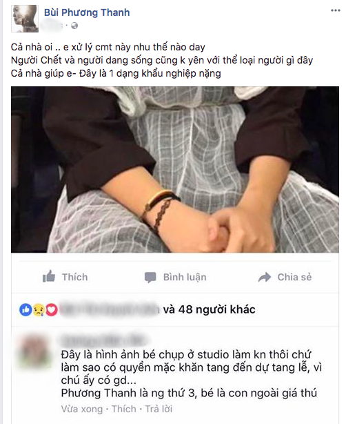 Cách đây ít giờ, trên trang cá nhân, Phương Thanh gây bất ngờ khi chia sẻ lại ảnh chụp bình luận từ một cư dân mạng trong bức hình bé Gà đội khăn tang tại tang lễ của bố. Theo đó, người này để lại ý kiến với giọng văn ác ý, cay độc: “Đây là hình ảnh bé chụp ở studio làm kỷ niệm thôi chứ làm sao có quyền mặc khăn tang đến dự tang lễ. Vì chú ấy có gia đình, Phương Thanh là người thứ ba, bé là con ngoài giá thú”.