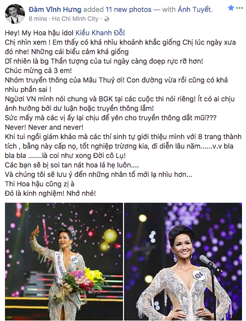 Đàm Vĩnh Hưng chúc mừng cả 3 người đẹp H'Hen Niê, Hoàng Thuỳ và Mâu Thuỷ.