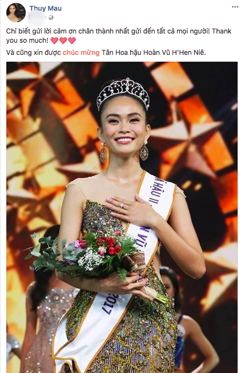 Đoạt vương miện Á hậu 2, Mâu Thuỷ không quên chúc mừng tân Hoa hậu.