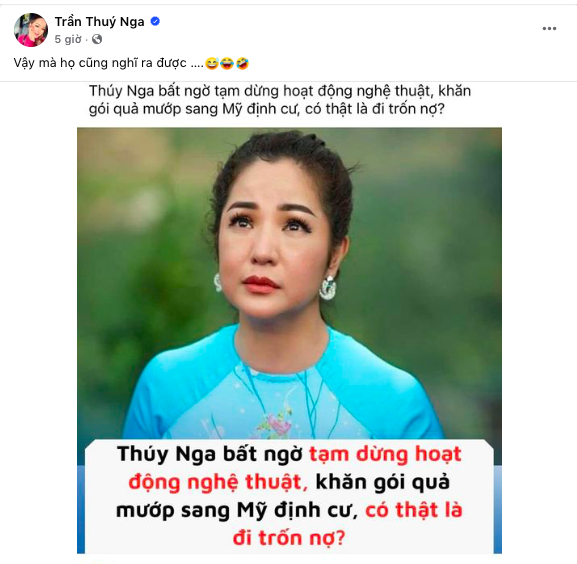 Theo đó, Thúy Nga bất bình đăng tải trên trang cá nhân hình ảnh bài viết với nội dung: "Thúy Nga bất ngờ tạm dừng hoạt động nghệ thuật, khăn gói quả mướp sang Mỹ định cư, có thật là đi trốn nợ?".