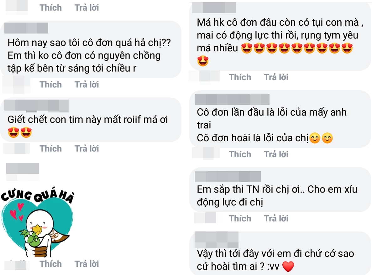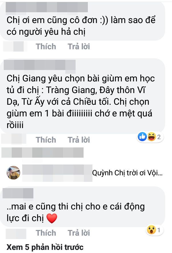 Chẳng ai ngờ bình luận nổi bật nhất dưới hình ảnh quyến rũ của Hương Giang lại là: “Chị Giang yêu chọn bài giùm em học tủ đi chị: Tràng Giang, Đây thôn Vĩ Dạ, Từ ấy với cả Chiều tối. Chị chọn giùm em 1 bài đi” hay “Em sắp thi rồi… căng thẳng quá chị ạ. Mong nhận được một chút động lực thi từ chị đẹp”.