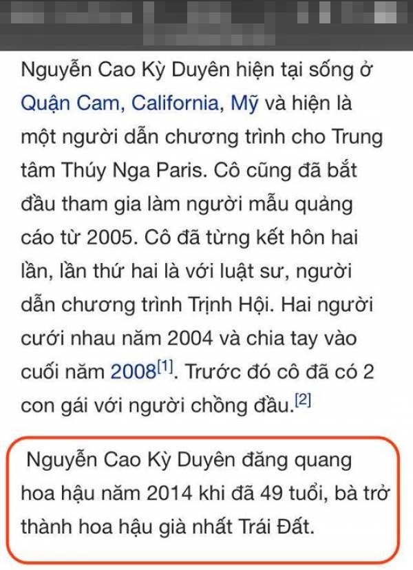 Ngay trên một trang báo mạng, nhiều người đã sửa đổi tiểu sử của MC Nguyễn Cao Kỳ Duyên (49 tuổi) thành… hoa hậu già nhất Trái đất cùng nhiều phiên bản khác. Khi đó, “phiên bản gốc” Nguyễn Cao Kỳ Duyên bày tỏ sự thích thú vì sự trùng tên thú vị.