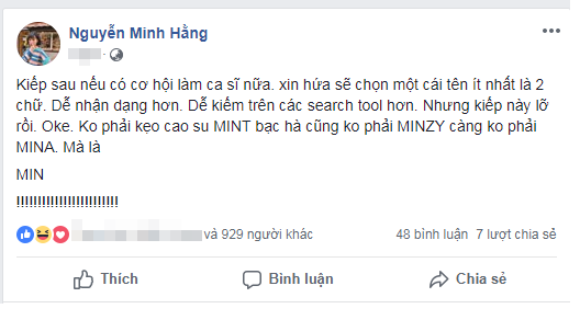 Mới đây, Min bất ngờ đăng dòng trạng thái của cô lên trang cá nhân những lời giải thích khá hài hước về sự nhầm lẫn trước nghệ danh “Min” của mình. Với nội dung cụ thể là: “Kiếp sau nếu có cơ hội làm ca sĩ nữa. xin hứa sẽ chọn một cái tên ít nhất là 2 chữ. Dễ nhận dạng hơn. Dễ kiếm trên các search tool hơn. Nhưng kiếp này lỡ rồi. Oke. Ko phải kẹo cao su MINT bạc hà cũng ko phải MINZY càng ko phải MINA. Mà là MIN”