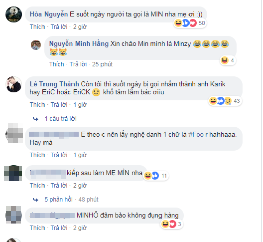 Những bình luận rất đồng cảm của các nghệ sĩ như Erik, Hòa Minzy về sự trùng nghệ danh thường xuyên gặp phải. Có fan còn khá “lầy” khi chia sẽ với Min rằng: “MinHô đảm bảo không đụng hàng”