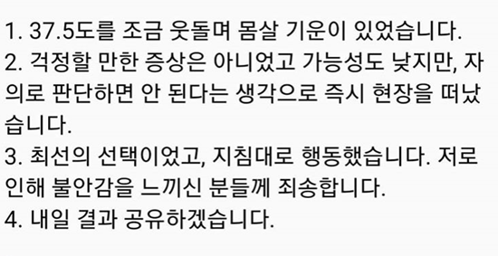 2. Tôi không nghĩ rằng đó là điều đáng lo ngại, và khả năng nhiễm phải virus corona thấp, nhưng tôi lập tức rời khỏi địa điểm vì tôi nghĩ rằng mình không nên tự xác định và đánh giá về sức khỏe.