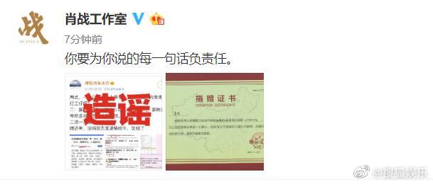 Mới đây, phòng làm việc Tiêu Chiến đã đăng bài viết làm rõ chuyện này, phủ nhận việc ngụy tạo bằng chứng, làm giả từ thiện, quyên góp dịch. Phía nam minh tinh đăng dòng trạng thái: “Bạn nên chịu trách nhiệm cho từng câu nói của mình”, kèm theo giấy chứng nhận ngôi sao Trần tình lệnh đã quyên góp, ứng phó với tình hình dịch bệnh virus Covid-19 lên đến 610 ngàn NDT (2 tỷ đồng).