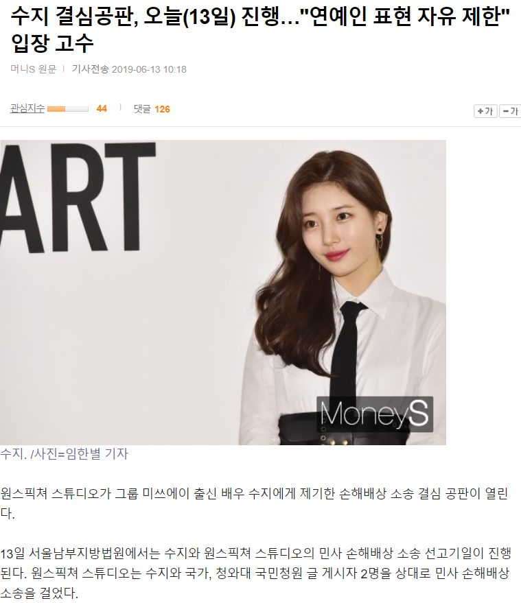 Vào ngày 13/06, Tòa án quận Nam Seoul đã tổ chức phiên tòa cuối xử kiện vụ việc giữa Suzy và studio chụp ảnh Once Picture. Được biết, stuido này đã đòi bồi thường thiệt hại 100 triệu won (gần 2 tỷ đồng) đối với nữ ngôi sao và hai cá nhân khác sau khi kiến nghị lên chính phủ.