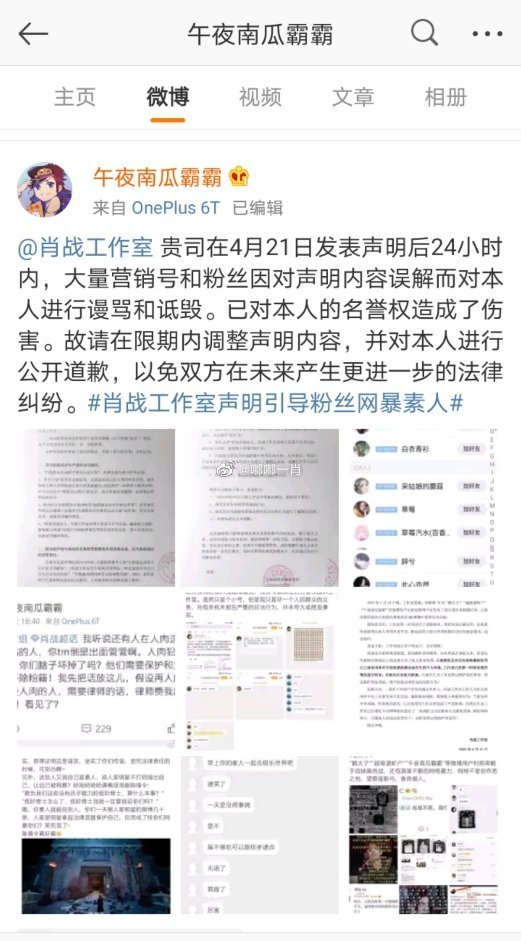 Sau khi bị phòng làm việc Tiêu Chiến cảnh cáo vào ngày 21 tháng 4, tài khoản Weibo có tên “Ngọ Dạ Nam Qua Bá Bá” đã đăng tải thư của luật sư, yêu cầu phòng làm việc Tiêu Chiến điều chỉnh nội dung đăng tải cũng như công khai xin lỗi với mình: