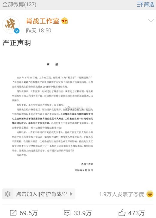 Chi tiết sự việc này bắt nguồn vào tối qua, phòng làm việc Tiêu Chiến đăng bài tố cáo tài khoản “Ngọ Dạ Nam Qua Bá Bá” công khai nói rằng thành viên nhóm fan Tiêu Chiến trong group chat QQ sử dụng tiêu đề phản động. Sau khi phòng làm việc điều tra, phát hiện những việc này đều là có người đứng sau ác ý xuyên tạc, thậm chí còn mạo danh nhân viên phòng làm việc và nam diễn viên công khai gạt tiền trên mạng xã hội… Tất cả sẽ giao cho pháp luật xử lý.